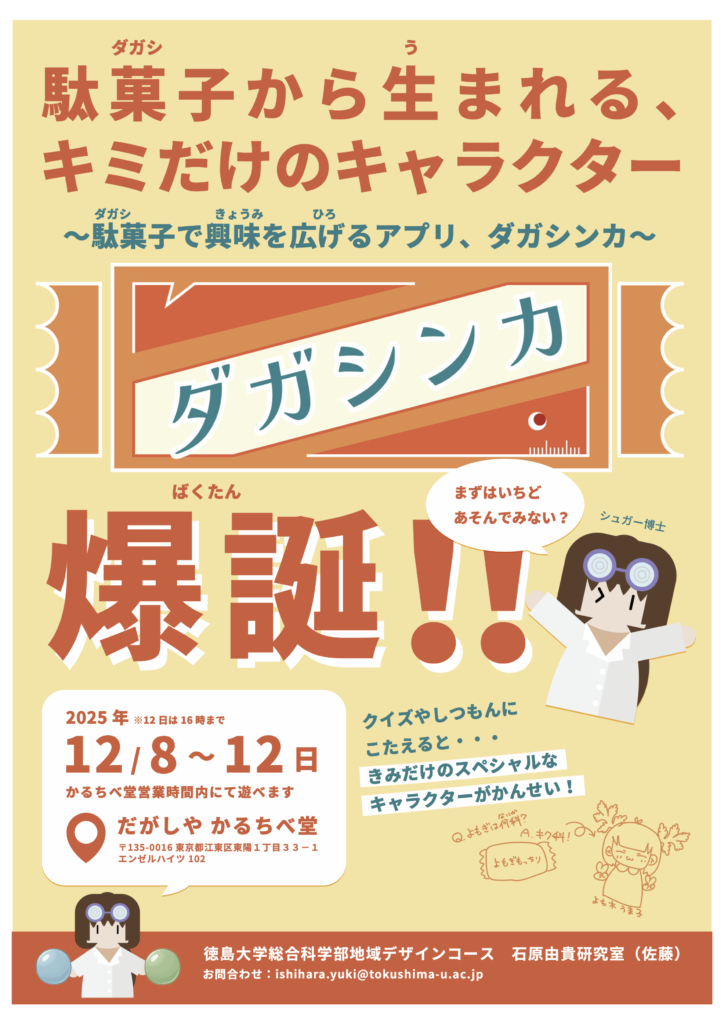 徳島大学総合科学部地域デザインコース 石原由貴研究室の佐藤氏による、研究の一環で「駄菓子で興味を広げるアプリ、ダガシンカ」の実証実験を行います。